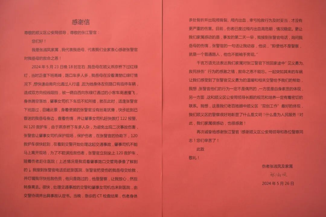 5月29日,肇事女司机送来了一面写有“人民警察为人民,危急时刻伸援手”的锦旗;5月31日,被撞人家属送来一面写有“见义勇为,救死扶伤,全心全意,为民服务”的锦旗和一封感谢信。