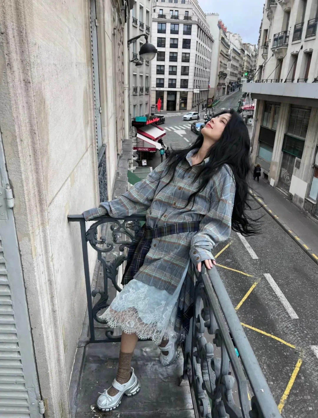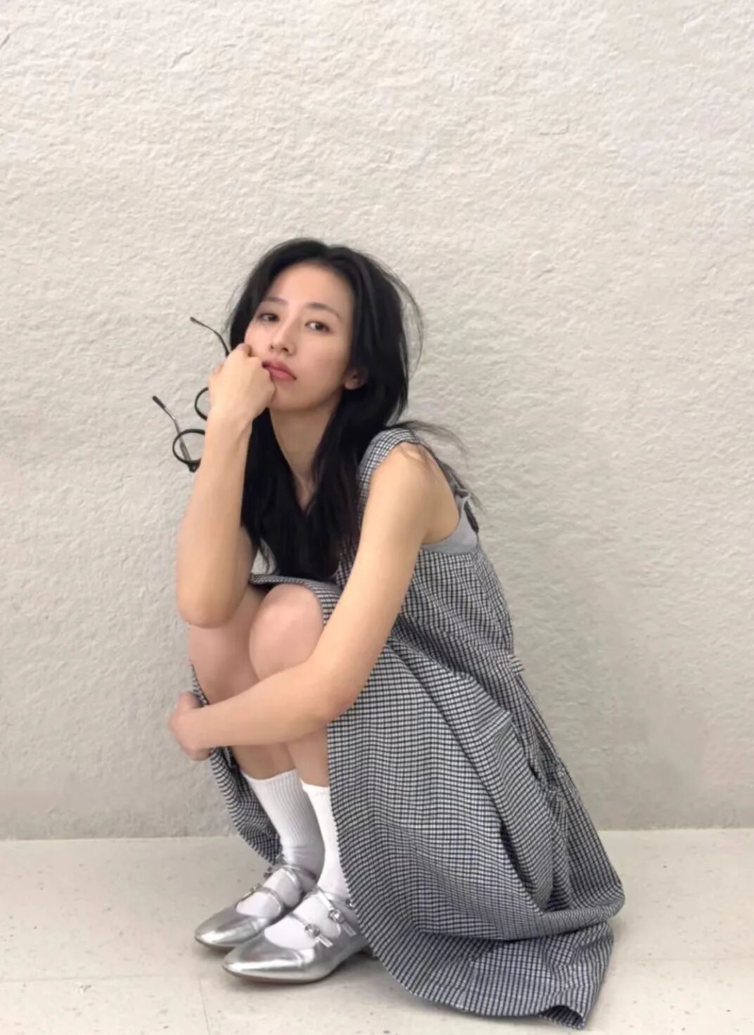 周雨彤身穿灰色格纹连衣裙搭配银色玛丽珍鞋,一双白色长筒袜简约利落,营造出时尚慵懒感。这款鞋子的设计充满了夏日的无拘无束自由感,浅色亮色的鞋子更是给穿搭增添了轻盈感。