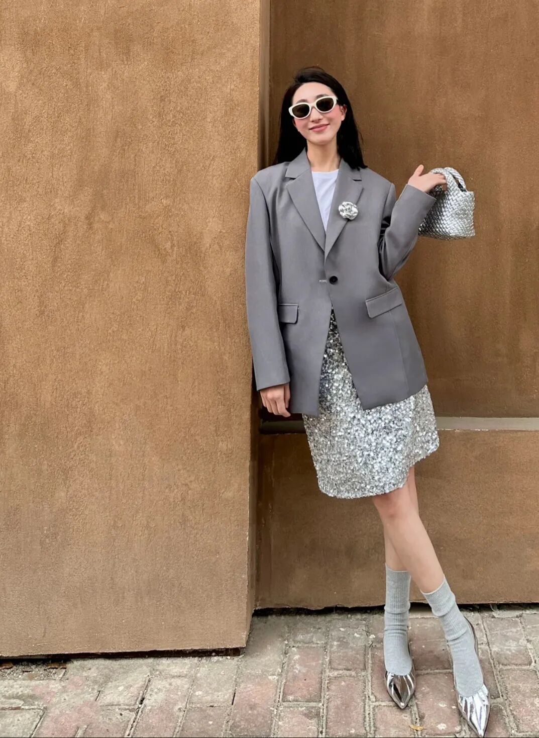 先来简单看一套小银鞋穿搭,这一套低饱和度高级感格雷系穿搭,搭配尖头小银鞋,银色镜面的反光感与褶皱相得益彰,一眼淡人穿搭。