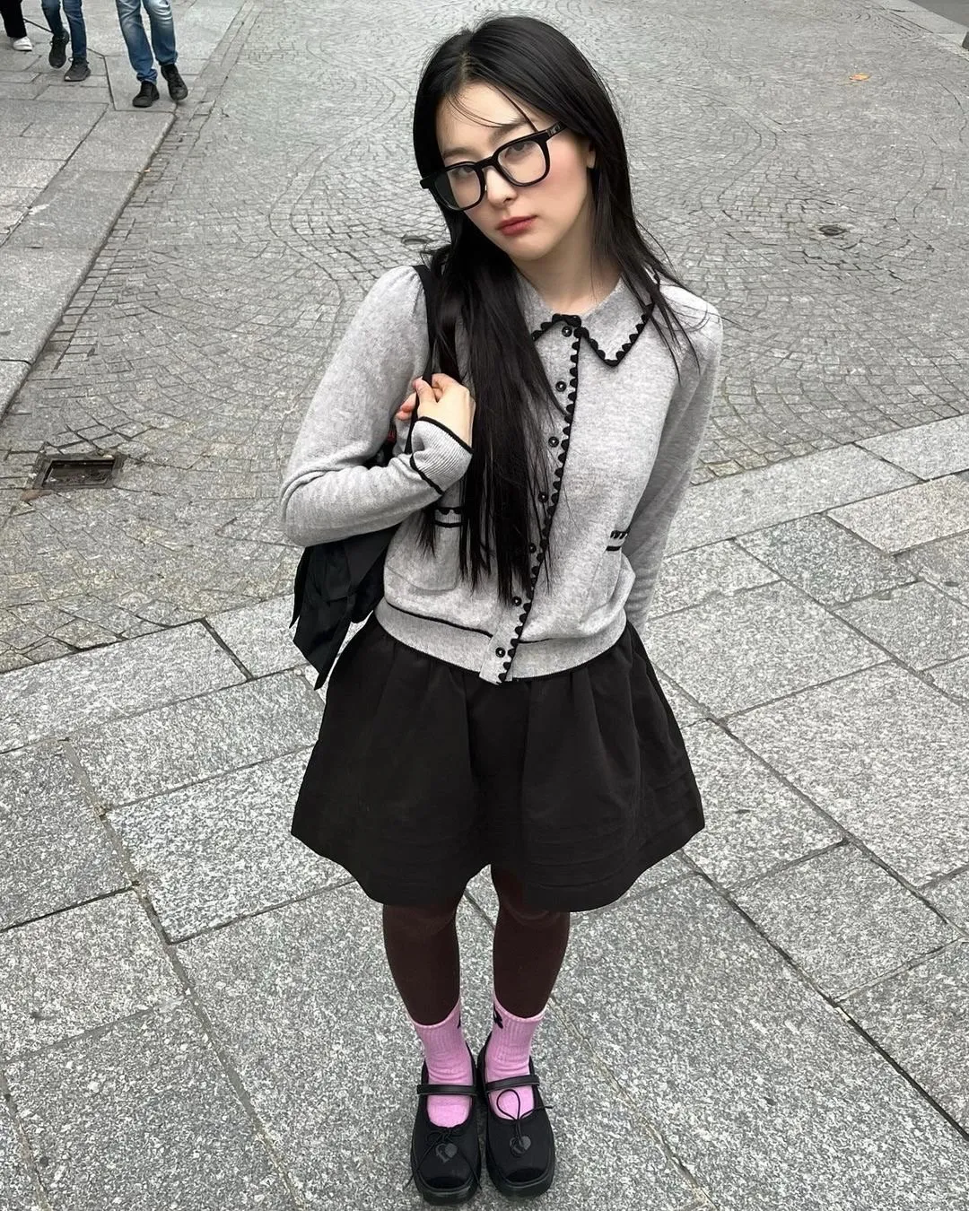 一直以来韩国女团对于玛丽珍都比较喜爱,女团成员姜涩琪更是玛丽珍鞋的忠实粉丝,在休假旅行的搭配中,黑色玛丽珍出镜率超高,在全身格雷系穿搭中,黑色玛丽珍搭配紫色袜子,让穿搭更具有看点。