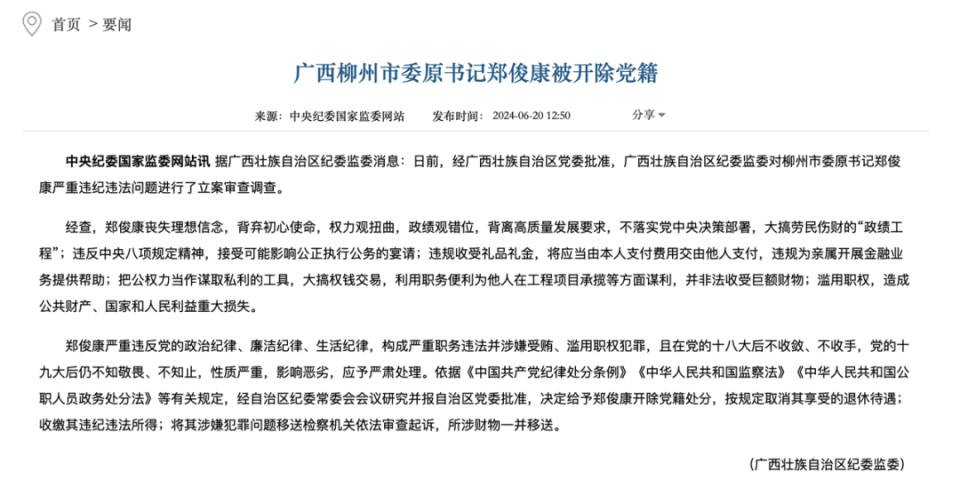 6月20日,广西柳州市委原书记郑俊康、吴炜同日被处理。
