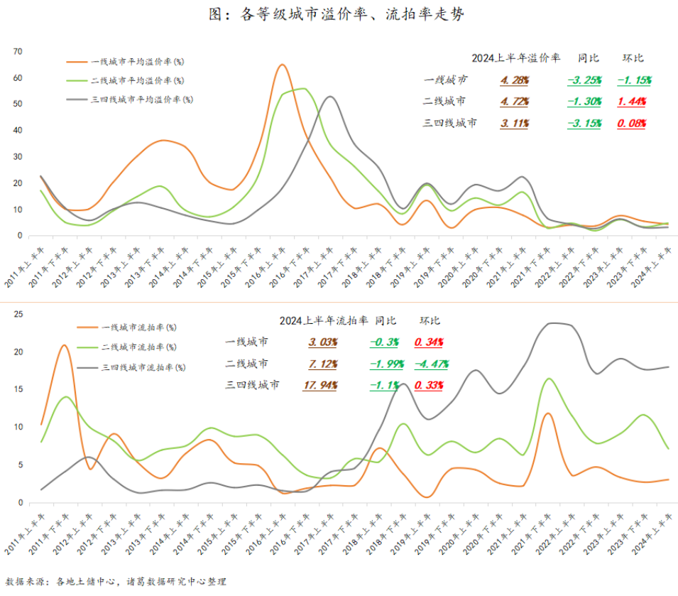从市场热度来看,稍有起色。上半年平均溢价率低位微升,流拍率高位微降。