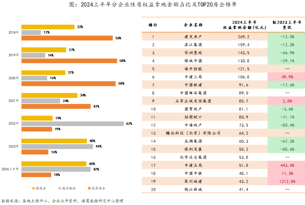 此外,上半年房企拿地格局未变,国央企及城投平台持续担当两大主力,不过节奏发生轻微改变,民营房企占比略有提升。数据显示,上半年国央企权益拿地金额占比40%,较2023年持平,代表企业有建发、华润、中海以及中建系等。地方城投权益拿地金额占比由上年44%降至42%,但整体占比仍然处于略微领先地位。