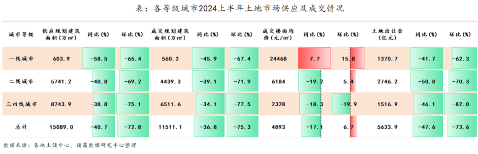 诸葛数据研究中心监测数据显示,2024上半年土地成交规划建筑面积11511.1万㎡,同比下跌36.8%,较去年下半年下跌75.3%;成交楼面价为4893元/㎡,同比下跌17.1%,较2023下半年小幅上涨6.7%。