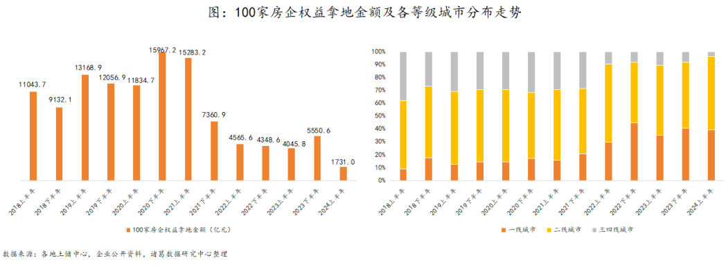 监测数据显示,上半年100家房企总权益拿地金额为1731亿元,同比下降57.21%,较去年下半年下降68.81%,总权益拿地金额创近年来新低。