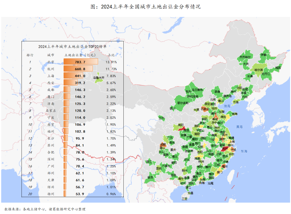报告显示,上半年全国土地成交金额为5633.9亿元,较去年下半年下降73.6%,较去年同期下降47.6%。从土地出让金TOP20城市榜单来看,重点一二线城市收金排行更为靠前。其中,北京以土地出让金783.7亿元位居全国首位,杭州以660.8亿元位居第二,上海则以441亿元位居第三。