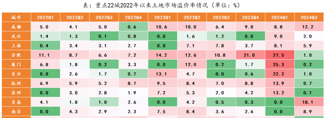 值得注意的是,仍有像成都、武汉、合肥、厦门、长沙等城市土拍呈现阶段性火热局面。其中,合肥一季度土拍平均溢价率达27.5%,诞生了新的单价、楼面价地王;成都、杭州等城市在限购全面取消等利好下,上半年尤其是一季度土地成交热度明显高涨。