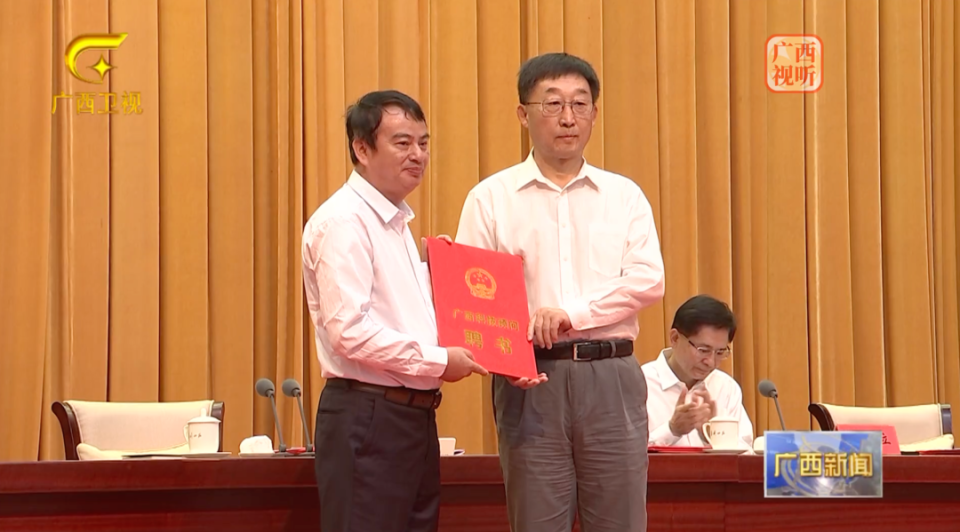 中国工程院院士张伯礼和中国科学院院士钱前获聘首批广西科技顾问,自治区党委书记刘宁颁发聘任证书。
