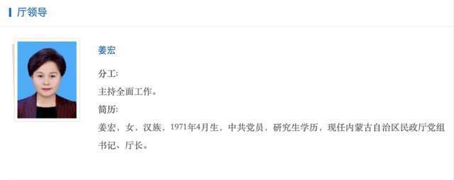 担任市长几年之后,2021年2月,姜宏出任内蒙古自治区民政厅党组书记,后任厅长。