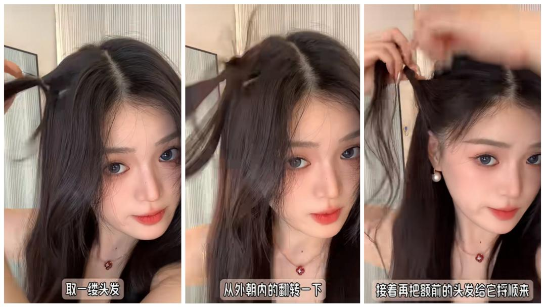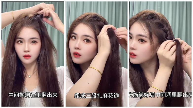 第一个发型我们跟着博主@是吕不是吕 学起来吧~超级适合研究不明白头发的姐妹们!首先在头顶四指距离取一缕头发扎起来,中间掏个洞,从外往内把头发翻进去,轻轻把头发扯蓬松,再将额前的头发扭几圈从洞里穿过,最后拿卷发棒将发梢卷出波浪型,适合手残党公主半扎发就成功啦,看文字就很简单的发型,姐妹们可以试试噢