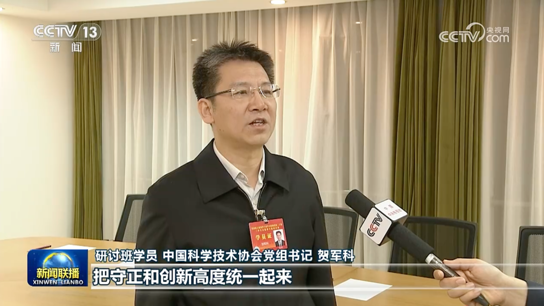 贺军科说,在推进科技体制改革中把“守正”和“创新”高度统一起来,我们将进一步领会总书记要求,找准科技群团在提升国家科技创新体系整体效能中的定位,统筹弘扬科学家精神,服务科技人才,桥接创新资源,科技决策咨询,促进公众科学素质方面的改革,团结引领广大科技工作者,为加快实现高水平科技自立自强、建设科技强国作出更大贡献。