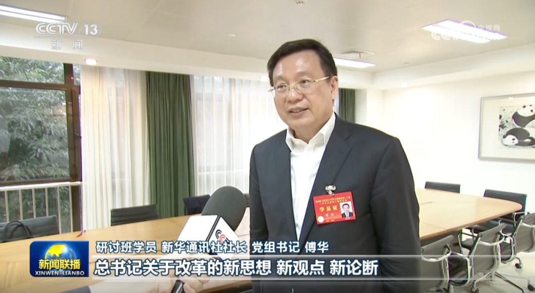 新华通讯社社长、党组书记傅华说,作为党的新闻舆论工作重镇,我们要把思想统一到总书记关于改革的重要思想上来,要宣传好、阐释好总书记关于改革的新思想、新观点、新论断,用科学理论为改革领航、铸魂、聚力,筑牢全社会共抓改革的思想基础、群众基础,要深刻认识、充分宣传新时代全面深化改革的历史性成就,要保持宏观取向的一致,就是万众一心、齐心合力、团结奋斗,来达成我们改革发展的共同目标。