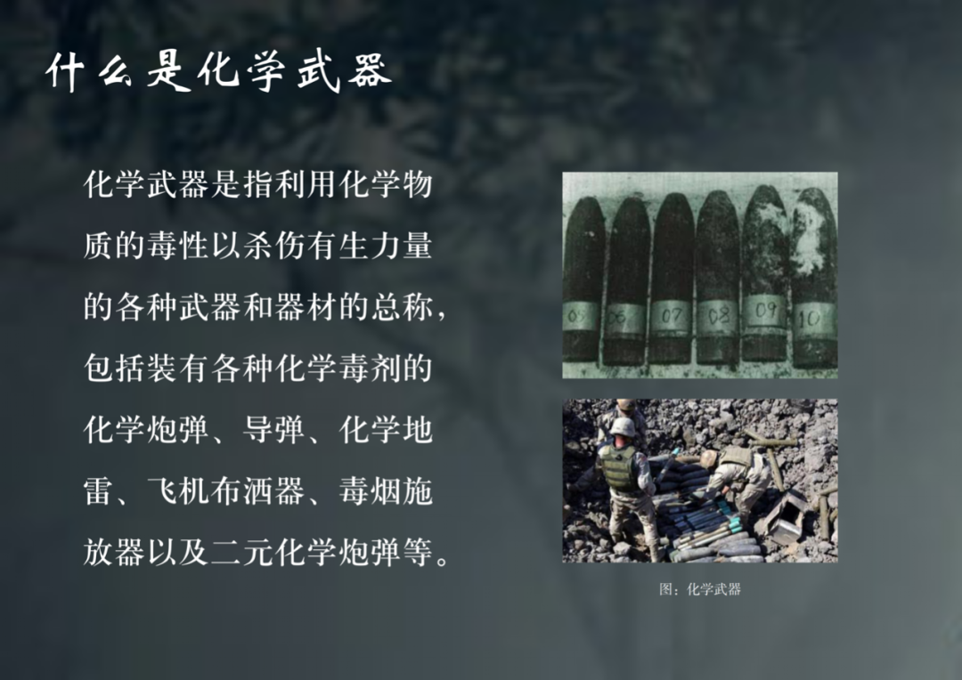 化学武器是指利用化学物质的毒性,以杀伤有生力量的各种武器和器材的总称,包括装有各种化学毒剂的化学炮弹、导弹等。1947年,联合国通过有关裁军协议,把化学武器与生物武器、原子武器正式定义为大规模杀伤性武器。