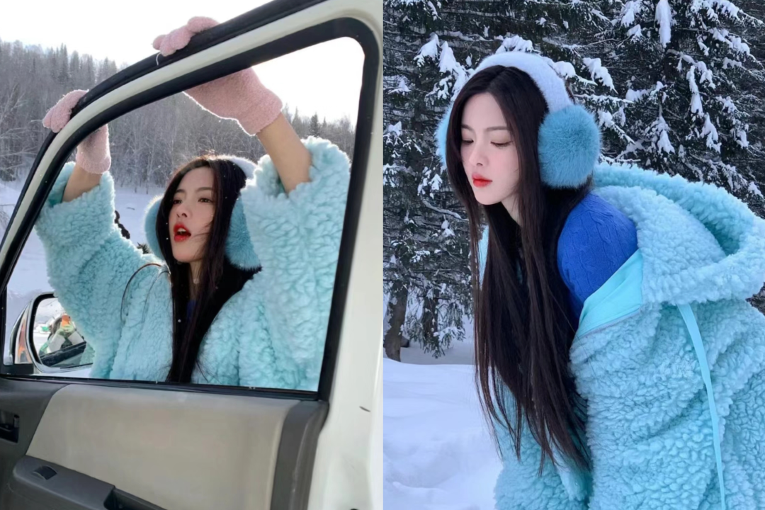 杨超越的雪地大片穿搭,在等初雪拍照的朋友们记好笔记,拿捏初雪大片。天蓝色的阔版型摇粒绒外套将整个人包裹在温暖舒适里,内搭深蓝色毛衣给浅色的画面赋予了一点亮色,同色系的耳罩在一片雪白之中蓝色的毛绒绒更显得有氛围感。