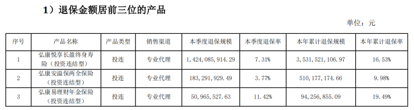 根据该报告,截止今年三季度,弘康人寿退保金额位居前三的产品均为投连险,三款产品本年累计退保规模超过了41亿元。其中,仅“弘康悦享长盈终身寿险(投资连结型)”一款产品在三季度的退保金融就达到了14亿元,全年退保金额累计高达35亿元。此外,另一款名为“弘康在线理财计划两全保险(投资连结型)”的投连险产品,在本季度的退保率达到了52.35%,位居该公司退保率排行榜首。