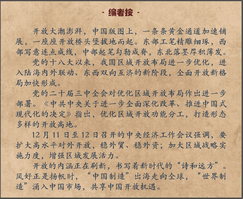 东部沿海地区是中国对外开放格局中的耀眼明星。作为“领头雁”,东部地区强化开放先导地位,带动中西部、东北和内陆沿边地区实现高水平对外开放,产生“雁阵效应”。