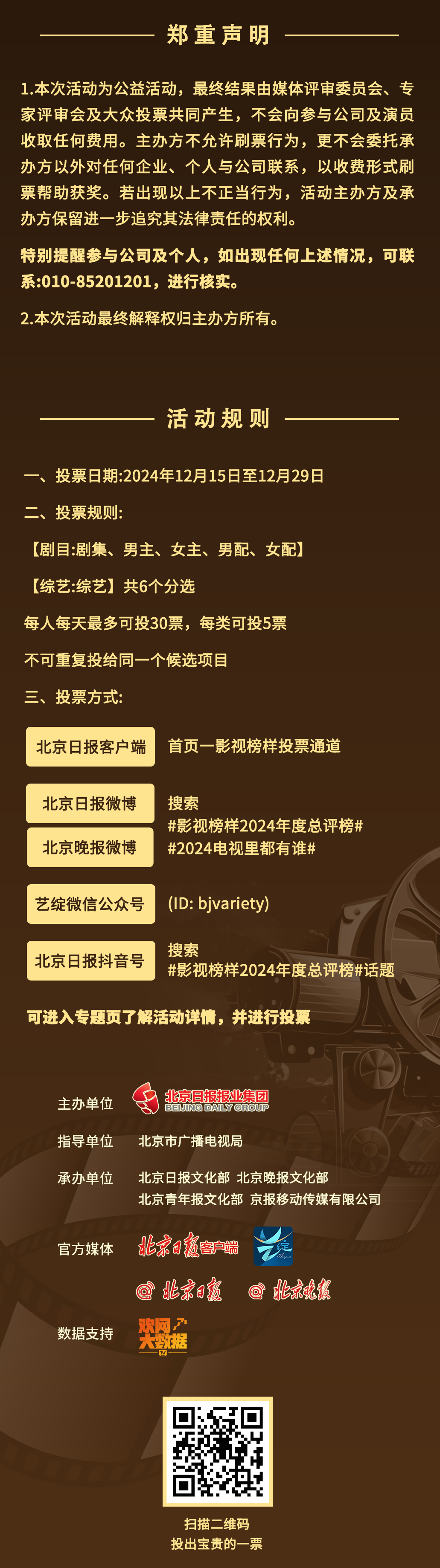 具体投票规则可参考以下长图,扫描图片末尾二维码,即可进入投票通道。现在赶快动动手指,为你喜欢的作品和演员投票吧!同时,您可将本文转发给更多朋友,为你喜欢的演员助力!
