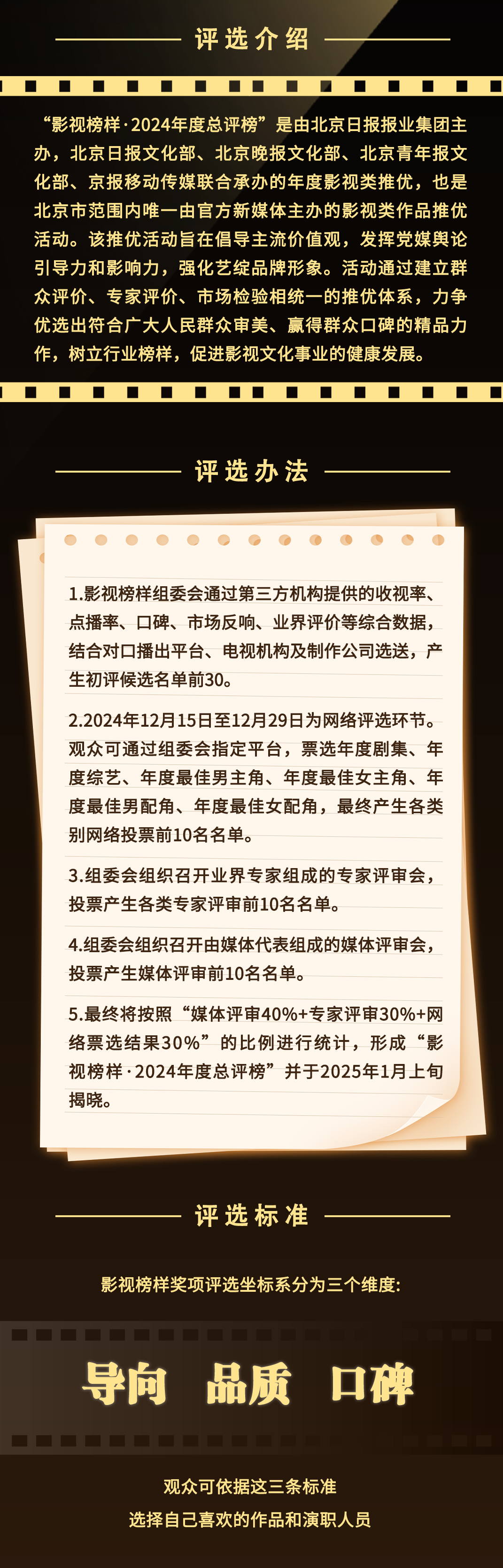“影视榜样·2024年度总评榜”是由北京日报报业集团主办,北京日报文化部、北京晚报文化部、北京青年报文化部、京报移动传媒联合承办的年度影视类推优,也是北京市范围内唯一由官方新媒体主办的影视类作品推优活动。该推优活动旨在倡导主流价值观,发挥党媒舆论引导力和影响力,强化艺绽品牌形象。