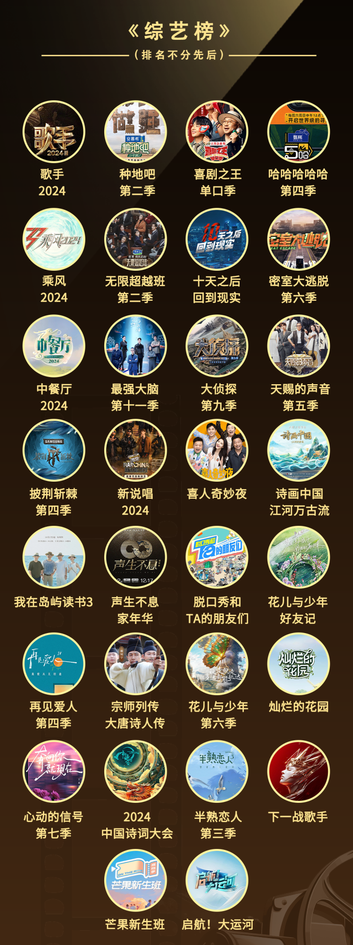 综艺榜单同样竞争激烈。《歌手2024》《种地吧第二季》《我在岛屿读书3》《声生不息·家年华》等老牌IP继续焕发活力,全新上线的《喜人奇妙夜》《脱口秀和TA的朋友们》《喜剧之王单口季》则让今年喜剧综艺的竞争日渐白热化,《诗画中国·江河万古流》《宗师列传·大唐诗人传》等文化类综艺则继续开拓着“文化+”的可能。