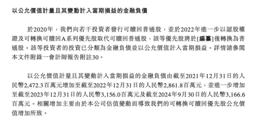 分析人士表示,由于这一类股权投资常常附带了一些优先权利如赎回权,因此会被视作为“优先股”,在会计计量中则被计入“以公允价值计量且其变动计入当期损益的金融负债”。然而,这种负债并不影响公司的经营和现金流,只是一种会计计量上的处理。许多的港股上市公司在上市前也都有这一项因为融资而造成的金融负债。上市后优先股产生的金融负债就将归零。