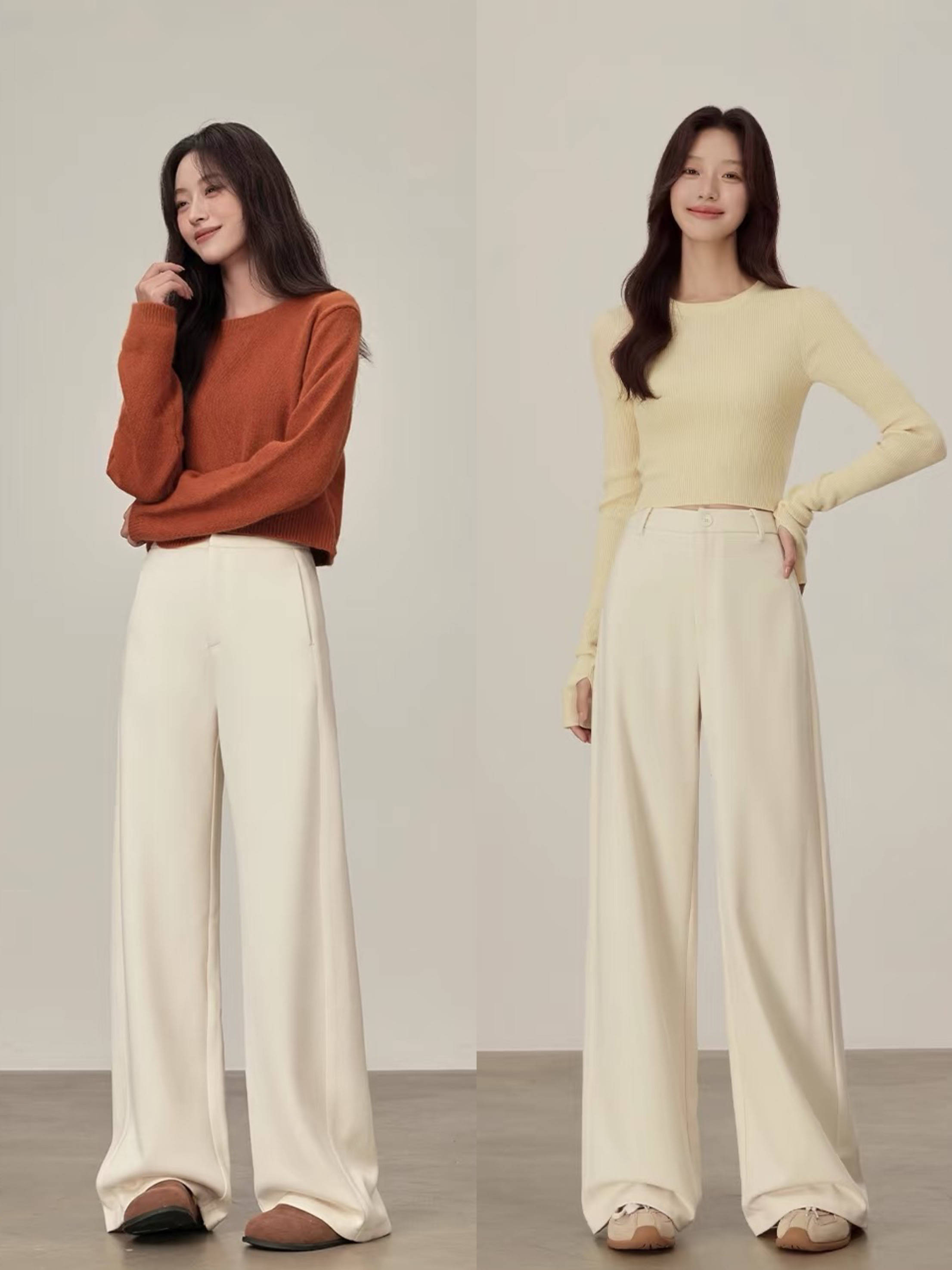 一条高腰的阔腿裤,柔和的米白色系、是一种简洁又大方的美。高腰阔腿裤,与短款的针织衫更配,小个子穿起来也能get大长腿。