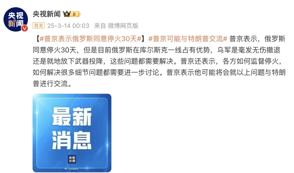 普京表示,俄罗斯同意停火30天,但是目前俄罗斯在库尔斯克一线占有优势,乌军是毫发无伤撤退还是就地放下武器投降,这些问题都需要解决。普京还表示,各方如何监督停火,如何解决很多细节问题都需要进一步讨论。普京表示他可能将会就以上问题与特朗普进行交流。