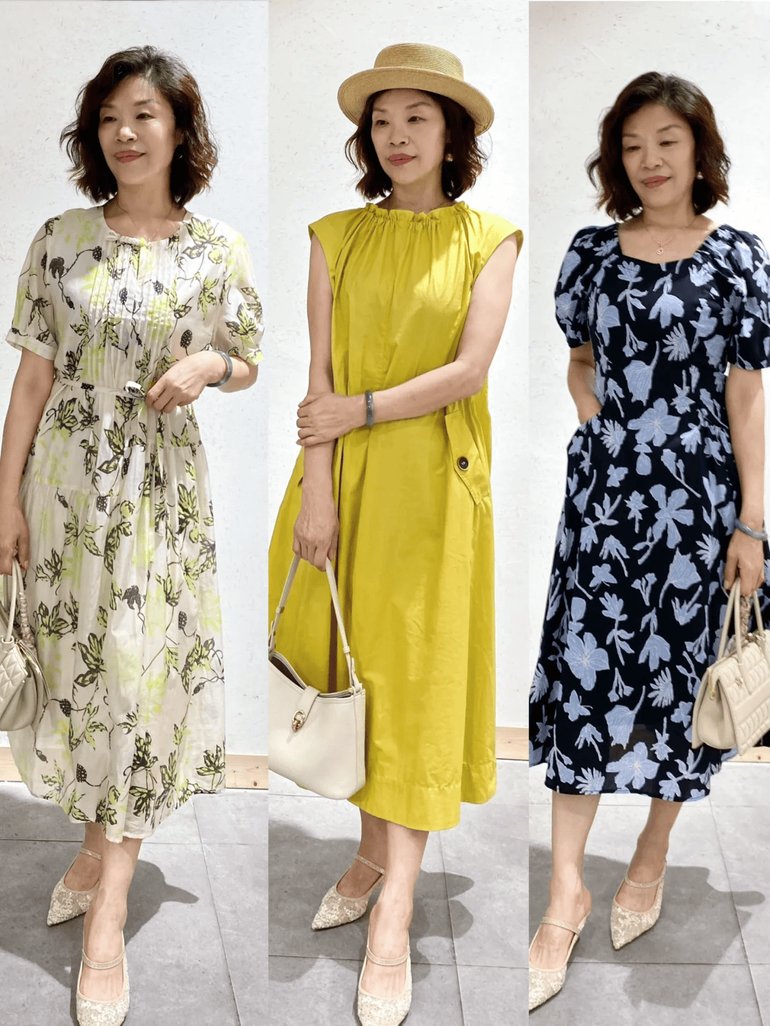 “裙子长上衣短”的搭配公式,能充分利用一短一长的组合,彰显出身形的三七分比例。在盛夏季节,裙装比裤装更具实用性,而宽松的裙装搭配又能满足大龄女性对穿搭舒适度的需求。