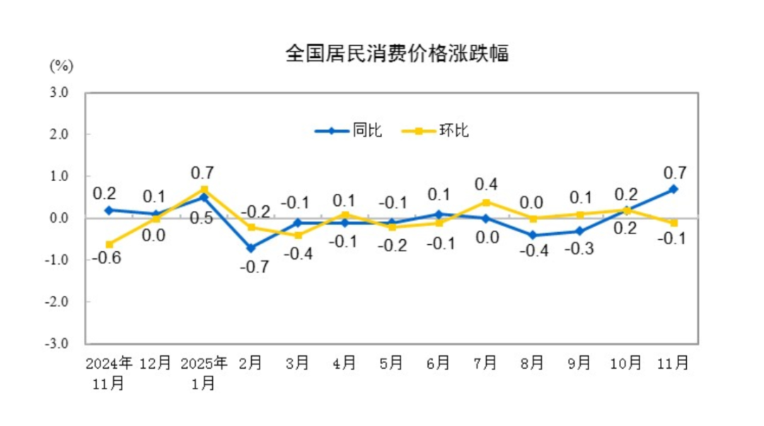 12月10日,国家统计局发布的最新数据显示,2025年11月份,全国居民消费价格同比上涨0.7%。其中,城市上涨0.7%,农村上涨0.4%;食品价格上涨0.2%,非食品价格上涨0.8%;消费品价格上涨0.6%,服务价格上涨0.7%。1—11月平均,全国居民消费价格与上年同期持平。