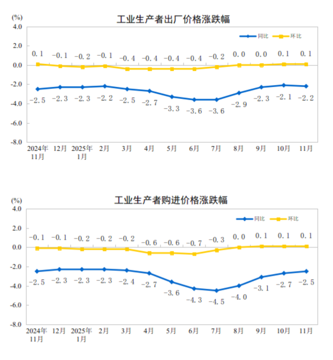 2025年11月份,全国工业生产者出厂价格同比下降2.2%,工业生产者购进价格同比下降2.5%;工业生产者出厂价格和购进价格环比均上涨0.1%,涨幅均与上月相同。1—11月平均,工业生产者出厂价格比上年同期下降2.7%,工业生产者购进价格下降3.1%。