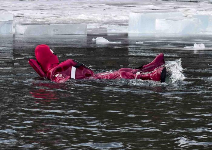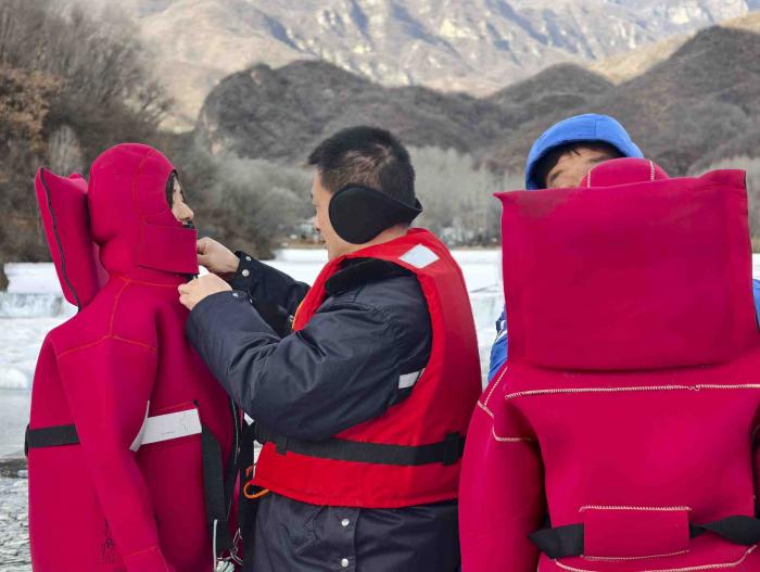 体验者穿着专用冰浮服采用防水防风、耐磨隔热的复合材质打造,面料柔韧抗撕扯,内部填充保暖材料,可隔绝冰面低温,同时具备良好浮力与缓冲性,既能保障漂浮姿态稳定,又能避免身体与冰面直接接触。