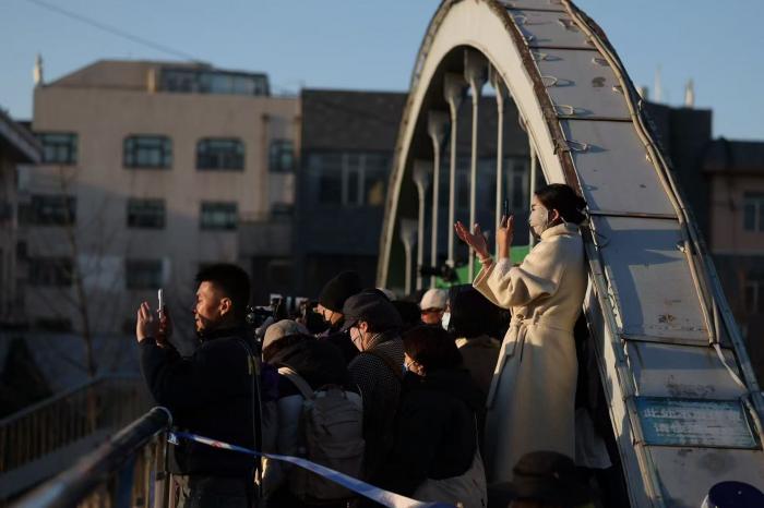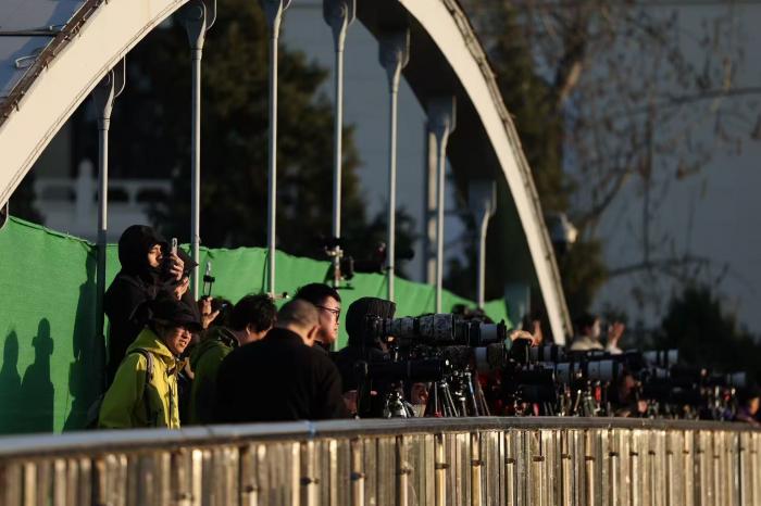 为捕捉这一难得画面,不少摄影爱好者提前三四个小时抵达天桥东侧占位。