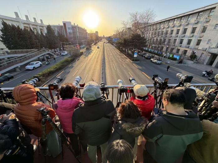 摄影爱好者的长、短镜头整齐对准天坛方向。市民或举手机拍摄,或驻足观赏。
