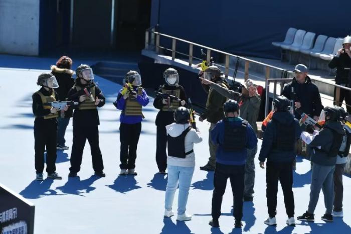 本次联赛设置了精准射击、战术对抗等多个环节。在战术对抗区,激烈的“枪声”此起彼伏。选手们头戴战术护具,手持BK2S发生器,在模拟街巷中穿梭。红蓝双方你来我往,攻防转换间尽显团队配合的默契。