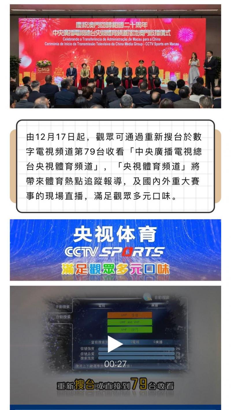 随着总台央视体育频道的正式落地,澳门观众从本月17日起,通过重新搜索数字电视频道第79台,即可收看中央广播电视总台央视体育频道的节目,满足了澳门同胞欣赏更多精彩体育赛事的愿望。