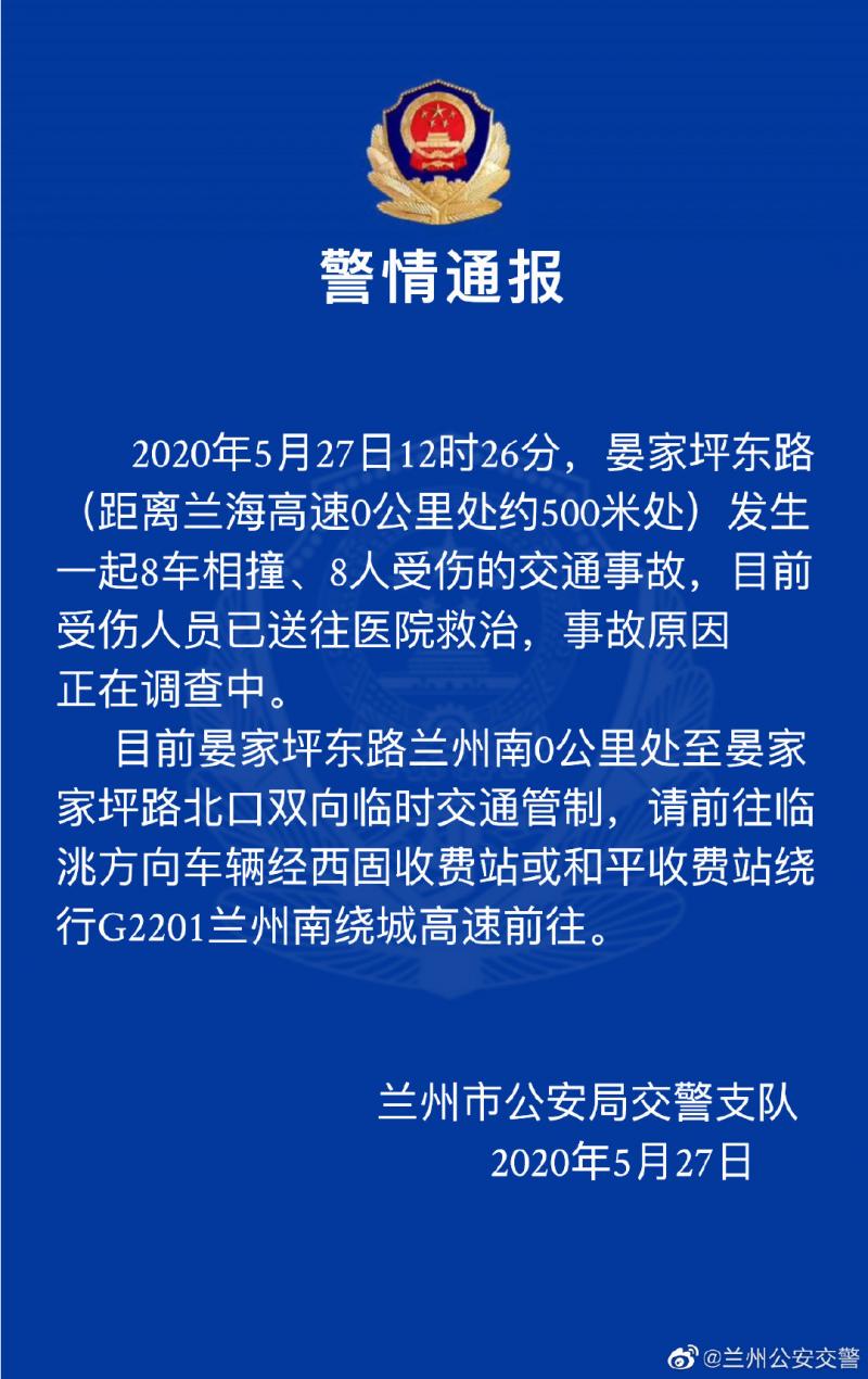 据甘肃兰州市公安局交警支队5月27日消息,2020年5月27日12时26分,晏家坪东路(距离兰海高速0公里处约500米处)发生一起8车相撞、8人受伤的交通事故,目前受伤人员已送往医院救治,事故原因正在调查中。