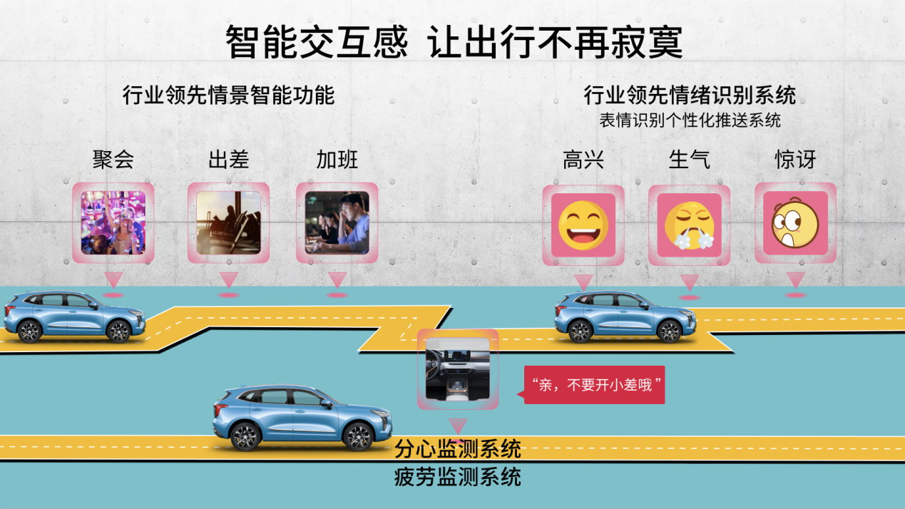 针对智能交互,哈弗初恋搭载了情景智能功能,可根据驾驶者穿越旅途中不同的外界环境、车速等,来主动提醒开关车窗、开空调、座椅通风加热等。此外,情绪识别功能,拥有表情识别个性化推送系统,能够通过分析驾驶员表情进行个性化推送,分心监测和疲劳监测功能可根据驾驶员的注视方向,及视线在该区域的停留时间等来分析驾驶员是否分心或疲劳。
