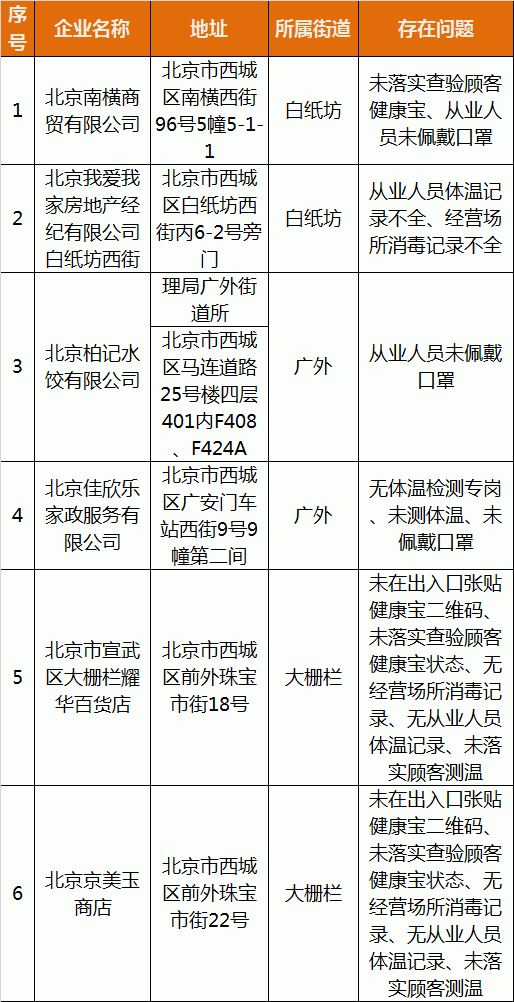 北京市西城区再通报6家未履行疫情防控主体责任企业名单
