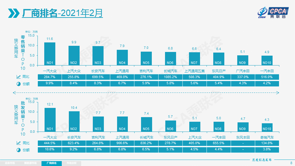 而2月份上汽大众复苏迹象比较明显,与一汽-大众间的差距进一步缩小。2月份上汽大众以9.9万辆的销量位居第二,而且市场占比也由1月份的7.7%上升至8.4%。上汽大众在不断巩固在燃油车市场地位的同时,今年又开始在新能源车市场发起猛烈“进攻”。1月份纯电动紧凑型SUV大众ID.4X上市,而另外一款纯电动中大型SUV大众ID.6X也将于今年第三季度上市。