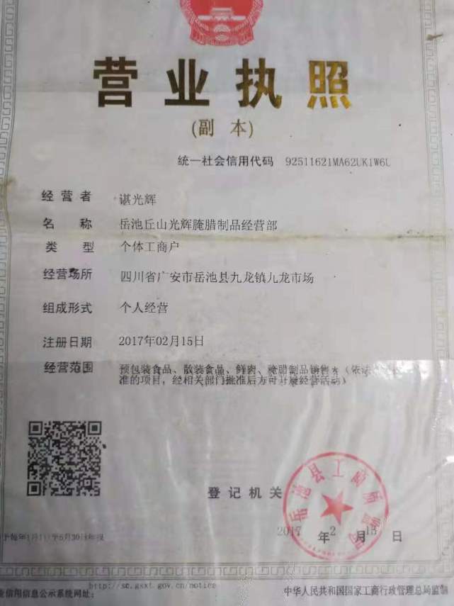 谌光辉这种自制土特产经营需要办理哪些手续?5月12日,北青-北京头条记者也咨询了岳池县市场监管局食品生产安全与食品流通安全监督管理股,工作人员介绍,商家销售农产品需要办理营业执照,如果也销售食品就需要办理食品经营许可证。“谌光辉如果只卖猪肉的话就只需要营业执照,但他是属于小作坊,也制作香肠,就需要小作坊备案证和食品小经营店备案证,这些他也都有。”