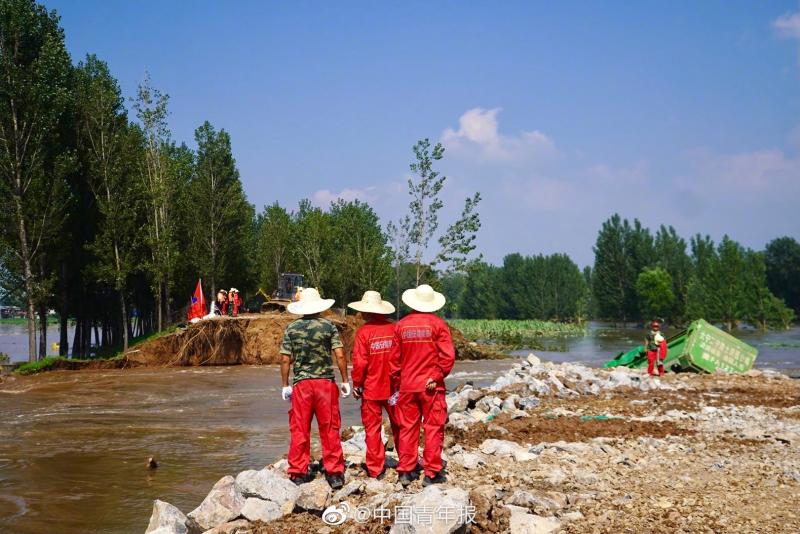 河南浚县新镇的卫河决堤口再次扩大,一侧堤坝垮塌