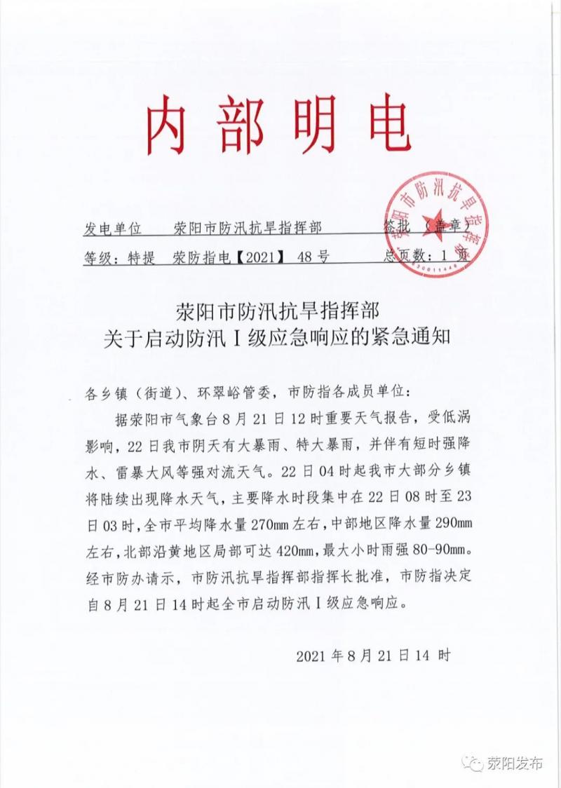 根据气象预警信息,河南荥阳市自2021年8月21日14时启动防汛Ⅰ级响应。防汛Ⅰ级响应期间,全市各级各部门要严格落实以下防范应对措施。