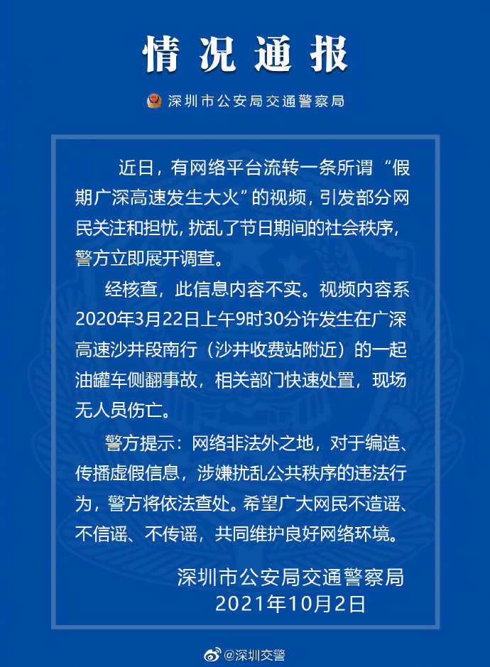 据深圳交警10月2日消息,近日,有网络平台流转一条所谓“假期广深高速发生大火”的视频,引发部分网民关注和担忧,扰乱了节日期间的社会秩序,警方立即展开调查。