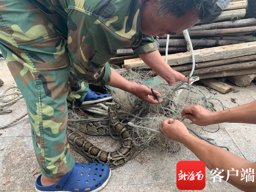 2米长蟒蛇被困渔网 昌江警民联手为其“解封”