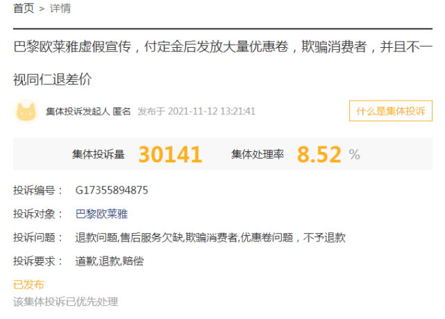 欧莱雅在消费者投诉平台被投诉量达3万多次