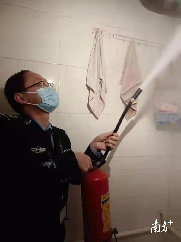 了解情况后,3名网格员在楼道里拿起灭火器飞奔上楼。