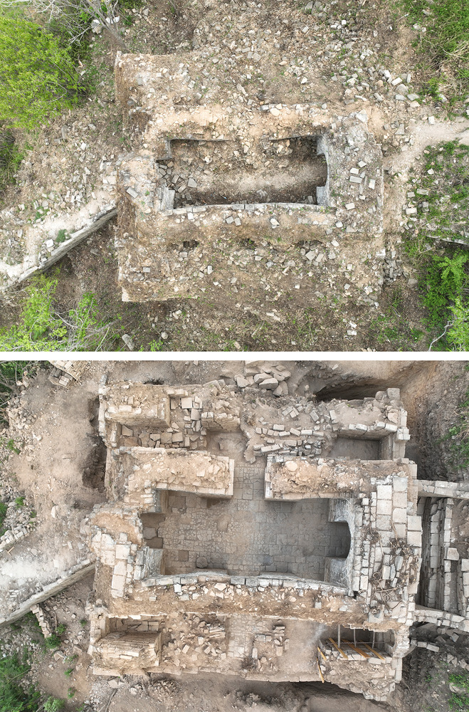 这是一张拼版照片。上图是考古前的大庄科段长城延庆4号敌台;下图是考古后的大庄科段长城延庆4号敌台。