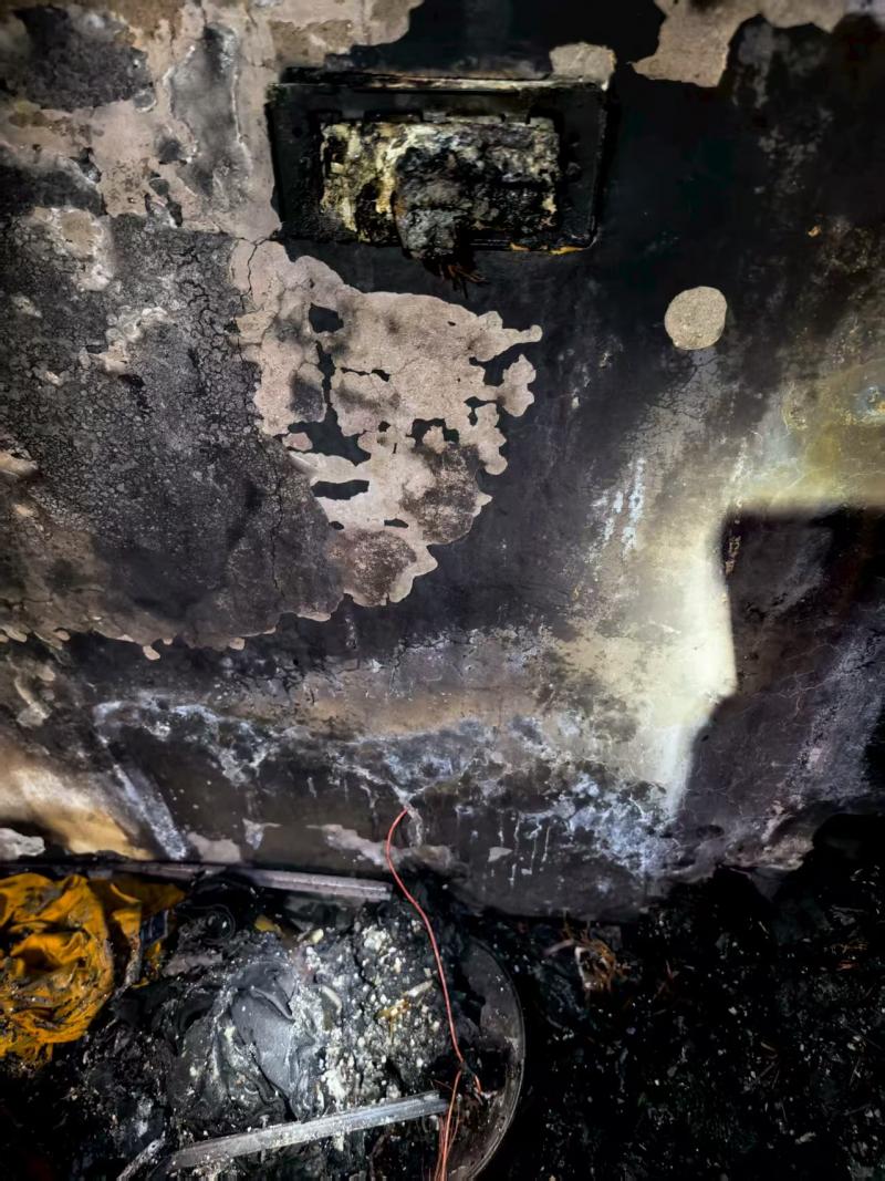 “火一下子就烧起来了,还有很大的烟,太吓人了。”任女士随后用湿毛巾捂住口鼻,将电源切断,用盆接自来水尝试着初期火灾的扑救。在现场勘察期间,居民卧室内一插线板上同时插有电暖气、小太阳等大功率电器,电暖气处烧毁严重。