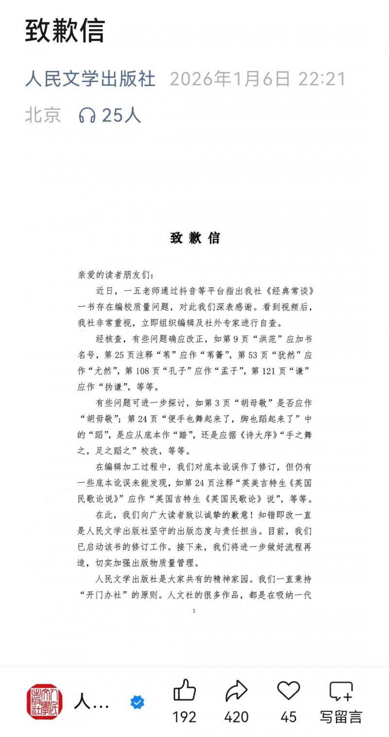 1月6日晚,人民文学出版社(以下简称人文社)发布致歉信,就此前博主一五老师指出的朱自清《经典常谈》存在编校质量问题致歉。