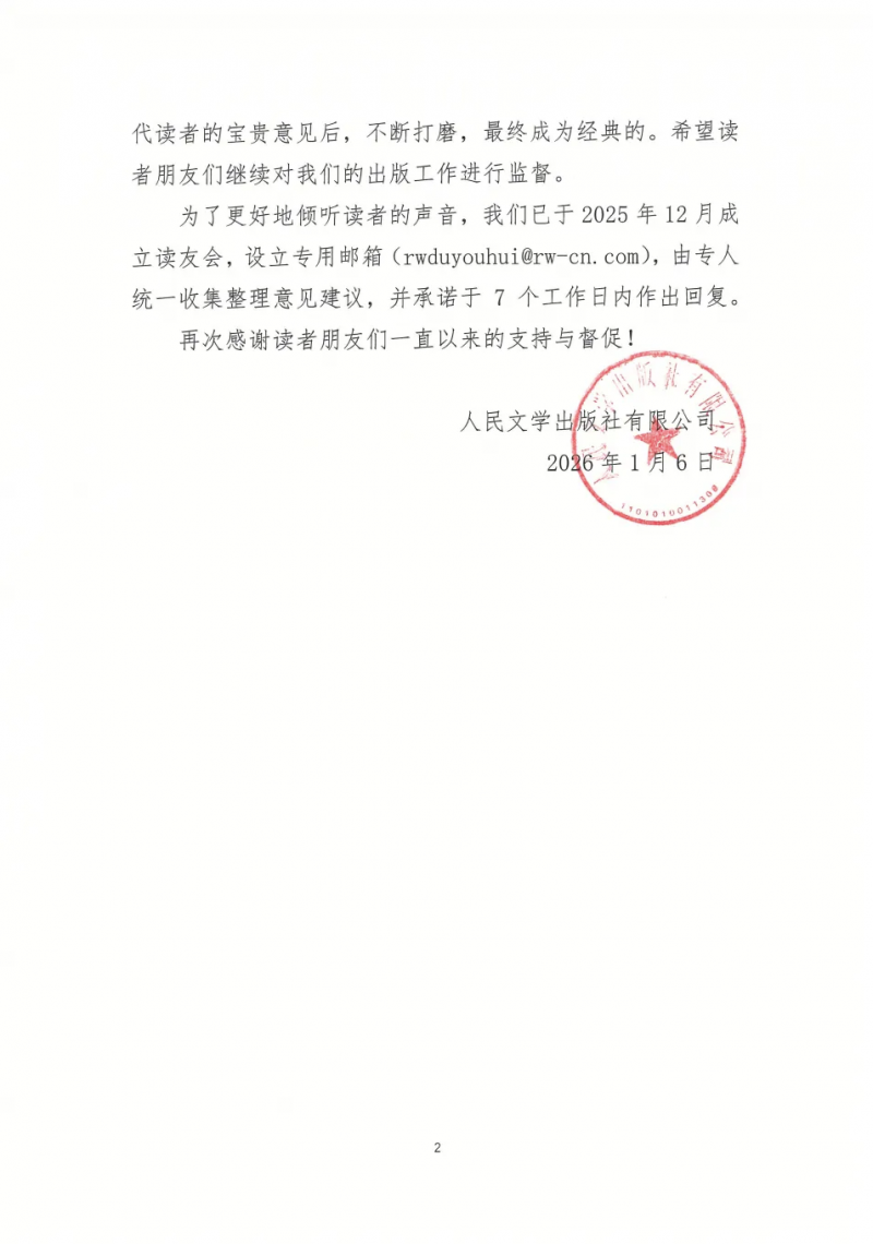 2025年12月底,人文社成立了读友会,并设立专用邮箱,由专人收集整理意见建议,并承诺在7个工作日内作出回复。