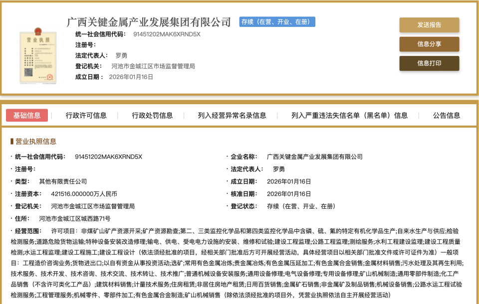 广西关键金属产业发展集团有限公司已经成立。